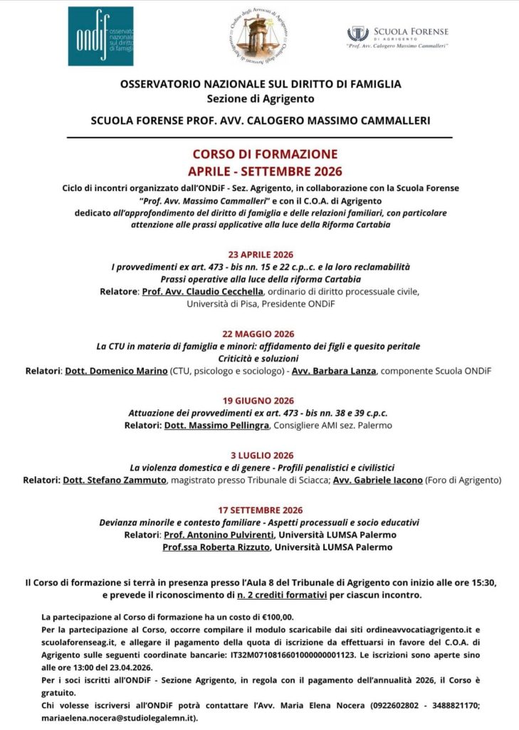 “Prof. Avv. Calogero Massimo Cammalleri” e dall’ONDIF – Sezione di Agrigento, è volto all’approfondimento del diritto di famiglia e delle relazioni familiari, con particolare attenzione alle prassi applicative alla luce della riforma “Cartabia”.